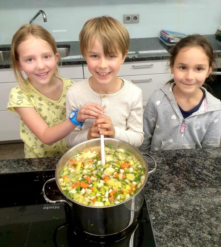 Gemeinsames Kochen als soziales Lernen von Alexandra Oberkalmsteiner 28. April 2026 Die 1. Klasse hat gemeinsam eine wunderbare Gemüsesuppe zubereitet. Zubereitet wurde sie mit Maggikraut und Schnittlauch aus unserem Schulgarten.